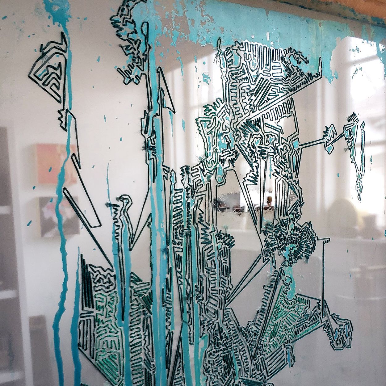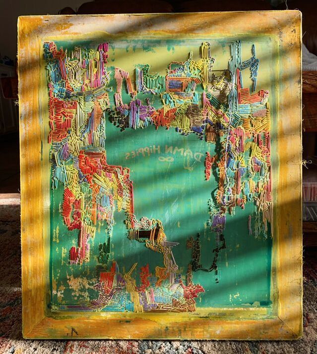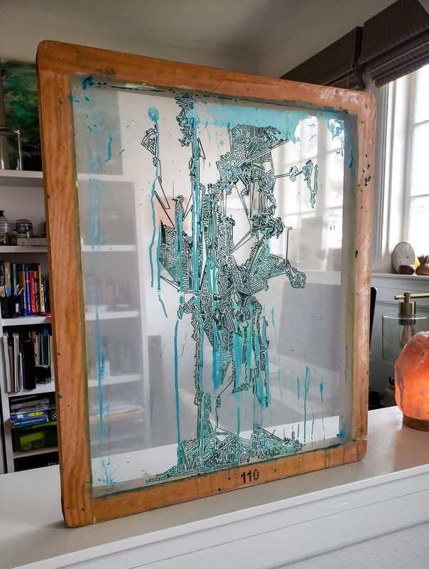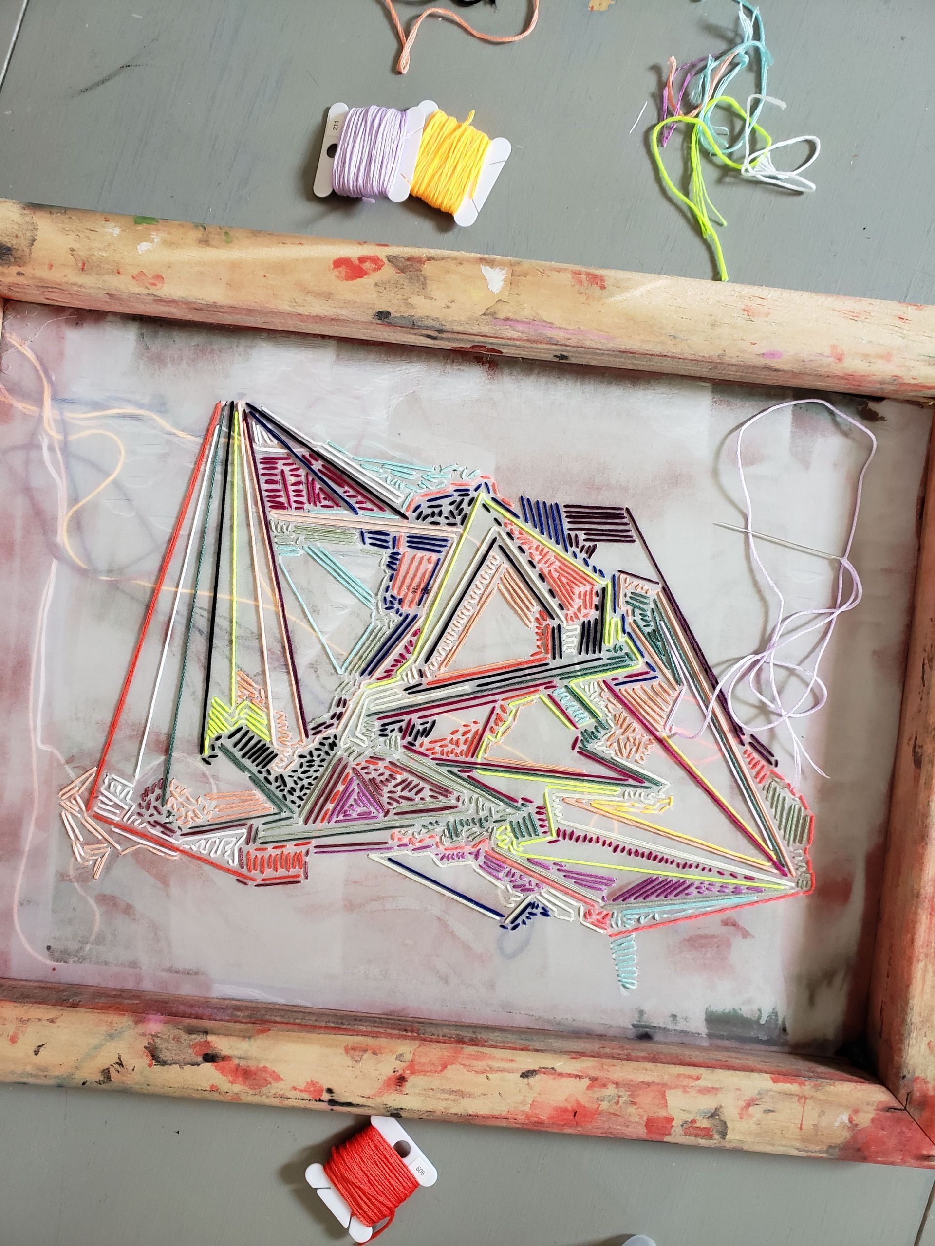 Using recycled silkscreens as a foundation for my embroidery, I stitch across and alongside the faded artwork and any remaining marks. The whimsical stitches running through both sides of the screen transform with the element of light and the transparency of the screen, making the aspect of light an integral part of the piece.