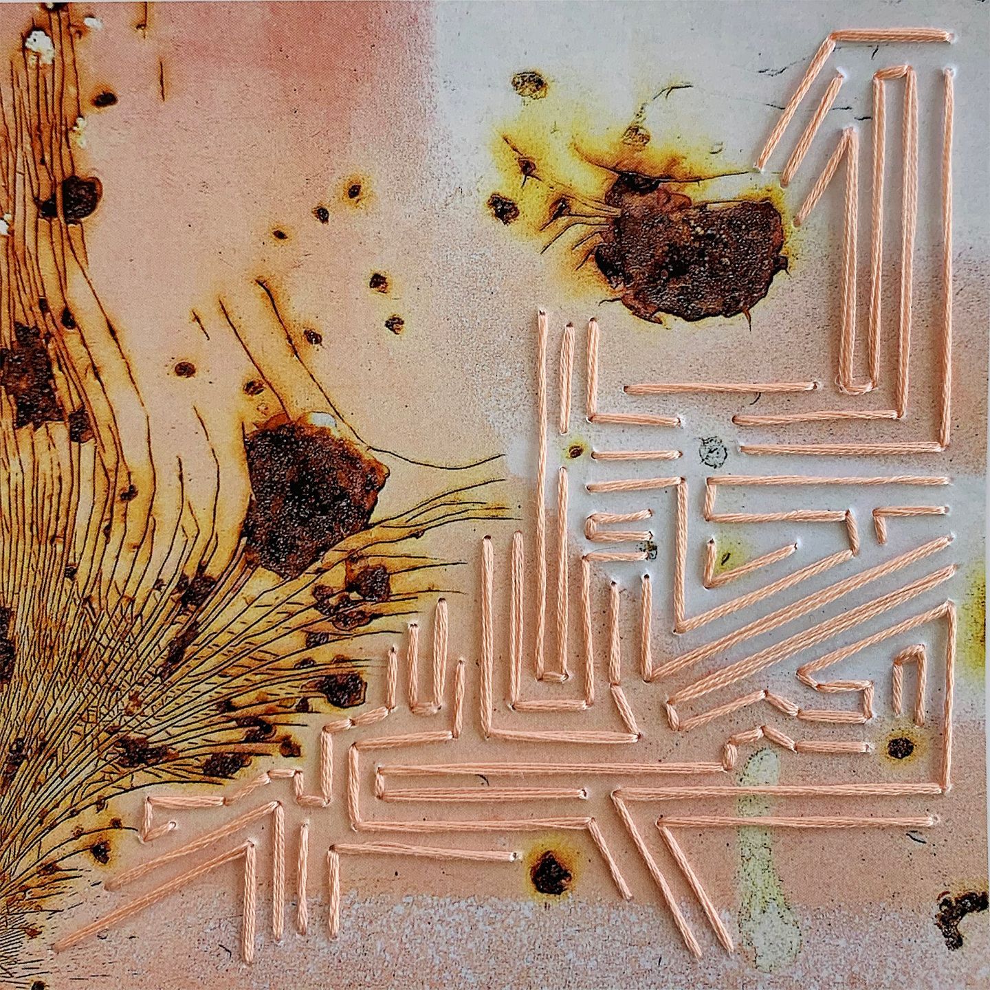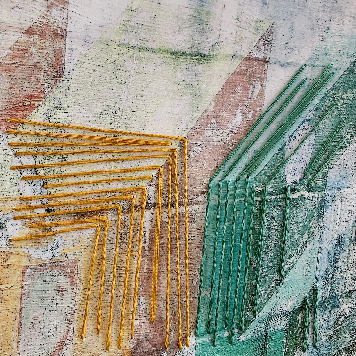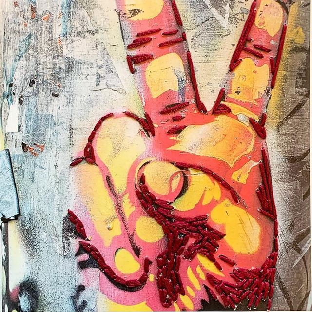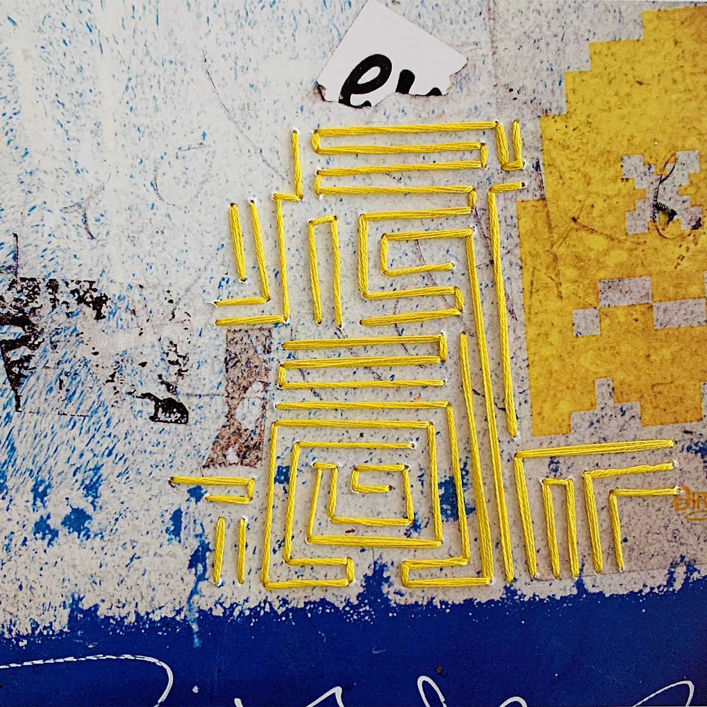 and graphic compositions with an added layer of hand-embroidery. The stitches mimic a lot of her illustrations and playful doodles she developed as a graphic designer and illustrator. The photography is from years of capturing torn graphics, textures and nature shots; these printed photos become the first layer for her final