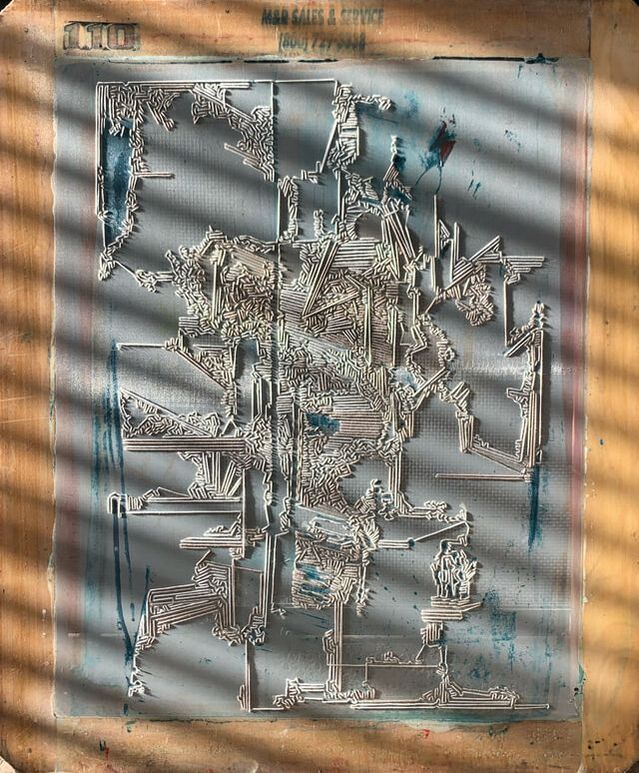 recycled silkscreens as a base for embroidery, which allow her to play imaginatively upon the ghosted images and residue left behind. The whimsical stitches transform with the element of light and the transparency of the screen, making the aspect of light an integral part of the piece.