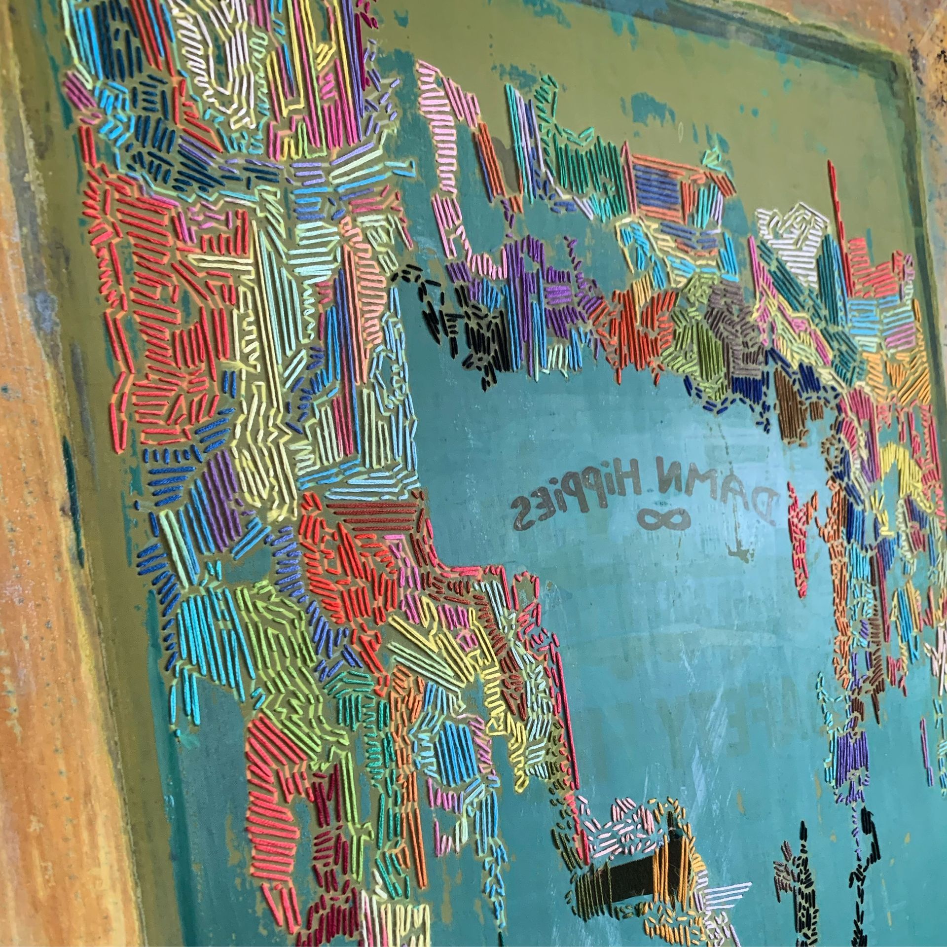 Using recycled silkscreens as a foundation for my embroidery, I stitch across and alongside the faded artwork and any remaining marks. The whimsical stitches running through both sides of the screen transform with the element of light and the transparency of the screen, making the aspect of light an integral part of the piece.