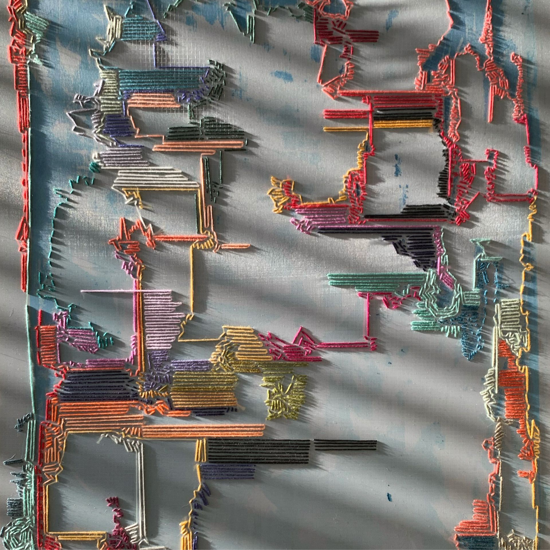 and graphic compositions with an added layer of hand-embroidery. The stitches mimic a lot of her illustrations and playful doodles she developed as a graphic designer and illustrator. The photography is from years of capturing torn graphics, textures and nature shots; these printed photos become the first layer for her final